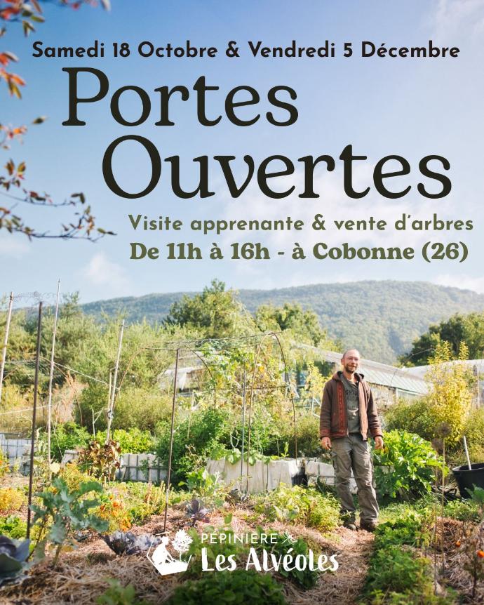 Vendredi 5 Décembre de 11h à 16hJOURNÉE PORTES-OUVERTES à la pépinière des Alvéoles !RDV pour une balade apprenante à la découverte du sol, de la forêt-jardin et de l’hydrologie régénérative.+ Vente d’arbres et de plantes !